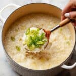 A close-up of a white hammered metal pot filled with creamy rice porridge, light beige in color with a soft, thick texture. In the center, a spoon with a wooden handle lifting a scoop of the porridge, topped with fresh, bright green sliced scallions that add a fresh contrast. The pot sits on a white marbled surface, and part of a woman's hand with clean nails is holding the spoon. The overall image feels warm and comforting. photo taken with an iphone --ar 4:5 --v 7