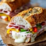 These Baked Italian Sub Sandwiches are a warm, flavorful twist on the classic deli sub. Featuring layers of Genoa salami, pepperoni, ham, provolone cheese, banana peppers, and red onions all baked inside a hoagie roll, this sandwich is brushed with a garlic and Italian seasoning butter for a perfectly melty, crispy finish. Perfect for an easy and satisfying lunch or dinner.