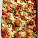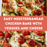 A flavorful and easy Mediterranean Chicken Bake featuring tender chicken breast pieces, fresh zucchini, cherry tomatoes, and aromatic herbs, topped with melted mozzarella and Parmesan cheeses. This one-dish meal is perfect for a wholesome dinner with vibrant Mediterranean flavors.