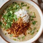 The dish is served in a white bowl with a brown rim, placed on a beige cloth. It has three main layers: at the base is a light beige creamy broth with a smooth texture, partly covering white steamed rice in the center. On one side of the rice, there is a layer of golden brown crispy fried onions with a crunchy texture. The whole dish is topped with bright green fresh cilantro leaves and thinly sliced green spring onions scattered evenly. Small drops of dark brown oil add a shiny contrast on the broth. Photo taken with an iphone --ar 4:5 --v 7