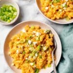 4. Finish and Season: Fluff the rice mixture with a fork and stir in shredded cheddar cheese, crumbled blue cheese, and chopped green onions. Taste and adjust seasoning with salt and pepper as needed before serving.