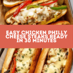 This Chicken Philly Cheese Steaks recipe offers a delicious twist on the classic Philly cheesesteak by using tender, thinly sliced chicken breasts or thighs sautéed with caramelized onions, colorful bell peppers, and melted provolone cheese all melted together in a skillet. Ready in about 30 minutes, these flavorful sandwiches are perfect for a satisfying weeknight meal or casual gathering, providing a savory, melty bite packed with bold flavors and juicy chicken.