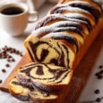 The image shows a loaf of braided bread with a golden-brown crust and twisted layers. Inside, it has a swirl pattern of dark chocolate and light dough, creating two main layers of rich dark brown and creamy yellow with soft texture. The top of the loaf is dusted lightly with white powdered sugar. Two slices are cut and laid flat in front of the loaf, showing the smooth swirls clearly. The loaf rests on a wooden board that is on a white marbled surface. Around it are a few scattered coffee beans and there is a white cup of black coffee blurred in the background. Photo taken with an iphone --ar 4:5 --v 7