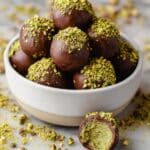 - Step 15: Dip each ball into melted chocolate, letting excess drip off. Garnish with chopped pistachios.