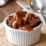 The cake layer is moist and tender with a soft, pudding-like topping that forms from the apple cider and spices during baking, creating a delightful contrast.