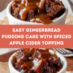 This Gingerbread Pudding Cake is a cozy, spiced dessert perfect for chilly evenings. Featuring warm notes of ginger and cinnamon, this moist cake is topped with a sweet, bubbling molasses and apple cider glaze that creates a deliciously gooey pudding layer. Made with simple ingredients including applesauce and molasses for a naturally rich flavor, this cake offers a comforting treat with a beautiful balance of sweetness and spice.