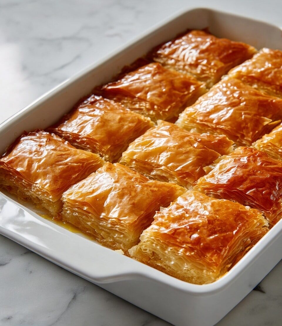 - Pour syrup: Immediately after removing the dessert from the oven, evenly pour the cooled lemon syrup over the hot galaktoboureko to soak in.