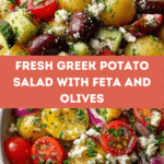 This Delicious Greek Potato Salad with Feta is a refreshing and flavorful side dish perfect for summer gatherings or light meals. Combining tender baby potatoes, briny Kalamata olives, creamy feta cheese, and fresh vegetables like cherry tomatoes, cucumber, and red onion, all tossed in a tangy, herbaceous dressing, this salad offers a perfect balance of textures and Mediterranean flavors.
