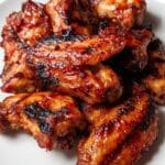 A white plate holds about seven pieces of grilled chicken wings piled together, each wing coated in a shiny, reddish-brown sauce that looks sticky and rich. The wings have visible black grill marks and some slightly burnt edges, giving them a charred texture. The surface of the wings looks glossy with a mix of crispy and tender parts, showing the cooked meat beneath the sauce. The photo is close up, capturing the detailed texture of the chicken skin and sauce. The background is a white marbled texture. photo taken with an iphone --ar 4:5 --v 7