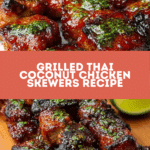 These Grilled Thai Coconut Chicken Skewers feature tender, juicy chicken marinated in a fragrant blend of coconut milk, ginger, garlic, and soy sauces, then char-grilled to perfection. Perfect for a flavorful and refreshing meal with a hint of sweetness from brown sugar and zesty lime juice.