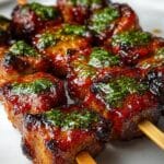 Two wooden skewers hold several pieces of grilled meat with a shiny, caramelized red-brown glaze and slightly burnt edges. Each piece is square and thick, showing a juicy texture under the glaze. Bright green herb sauce is lightly spread on top of the meat pieces, adding a fresh color contrast. The skewers rest on a smooth, white plate placed on a white marbled surface. Photo taken with an iphone --ar 4:5 --v 7