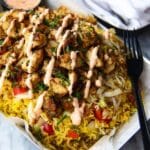 This Halal Cart Chicken and Rice is a flavorful copycat recipe inspired by the iconic New York street food. Tender, marinated chicken thighs are pan-seared to perfection, served alongside fragrant turmeric and cumin-infused basmati rice, and topped with a zesty, creamy yogurt-sriracha sauce. Perfect for an easy weeknight dinner or to impress guests with bold Middle Eastern-inspired flavors.
