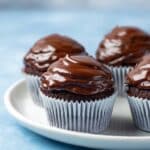 The image shows four chocolate cupcakes on a white plate, placed on a blue surface. Each cupcake is in a white paper liner with a dark cake base. The top layer is a thick, glossy chocolate frosting with a smooth, slightly swirled texture that catches the light with shiny reflections. The cupcakes have no other visible decorations and sit close together on the plate. The background is softly blurred in a light blue tone. photo taken with an iphone --ar 4:5 --v 7