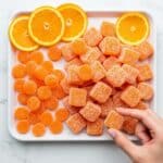 Store the orange candy in an airtight container at room temperature or in the refrigerator for up to 1 week. Keep pieces separated with parchment paper to prevent sticking. To enjoy, let refrigerated candy come to room temperature for the best texture, or warm slightly before serving.