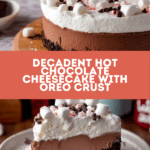 Keywords: hot chocolate cheesecake, Oreo crust cheesecake, chocolate cheesecake, holiday dessert, creamy cheesecake