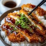 Japanese Katsu Bowls with Tonkatsu Sauce feature crispy, golden fried chicken cutlets served over steamed rice, drizzled with a tangy and sweet homemade tonkatsu sauce, and garnished with fresh green onions and sesame seeds. This satisfying dish combines crunchy textures with rich umami flavors, perfect for a comforting meal inspired by classic Japanese cuisine.