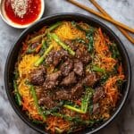 Japchae is a classic Korean dish featuring sweet potato glass noodles stir-fried with tender beef and a colorful array of vegetables. This savory and slightly sweet noodle stir-fry is flavored with soy sauce, garlic, sesame oil, and brown sugar for a perfect balance of taste and texture. It’s a flavorful and nutritious meal that can easily be adapted to include chicken, tofu, or shrimp for different protein options.