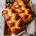 Two golden brown braided loaves of bread with a glossy crust sit side by side on a round wicker tray lined with parchment paper. The soft texture and light cracks show the fresh baking, while the bread's curved, puffed Braids top each loaf in a pattern of connected segments. The tray rests inside a wooden box over a white marbled surface, and a gray cloth is tucked behind the bread, adding a soft contrast to the golden color of the loaves. photo taken with an iphone --ar 4:5 --v 7