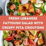 Fattoush is best served fresh to keep the pita crisp. Store leftovers without the pita in an airtight container in the fridge for up to 2 days. Re-toast pita pieces just before serving to restore crunch.
