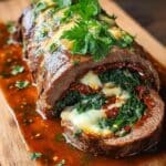 Beef braciole is a classic Italian dish featuring thin slices of flank steak rolled around a savory filling. This melt-in-your-mouth version combines tender beef with a flavorful mix of spinach, cheese, and sun-dried tomatoes, all simmered in rich marinara sauce.