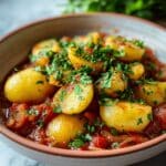 A close-up of a deep white bowl filled with a stew made of small yellow potatoes cut in halves on top, with a layer of finely chopped fresh green herbs sprinkled over them. Below the potatoes, there is a thick tomato-based sauce with visible chunks of cooked tomatoes and pieces of onion, adding red and light brown colors and a textured look. The surface beneath the bowl is white marble with faint gray lines, and a blurred bunch of fresh green herbs is in the background. The lighting highlights the freshness and warmth of the dish, showing light reflections on the sauce and potatoes. photo taken with an iphone --ar 4:5 --v 7