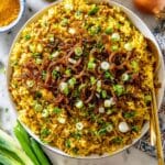 - Serve Mujadara: Transfer the lentil and rice mixture to a large serving platter. Top with the remaining caramelized onions, reserved scallion tops, and additional parsley for garnish.