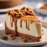 The image shows a slice of creamy cheesecake on a white plate. The cheesecake has a thick, smooth filling atop a crumbly, brown biscuit crust. The top of the cheesecake is adorned with a generous swirl of caramel or butterscotch sauce and sprinkled with crumbled biscuit pieces, adding texture and richness to the dessert. The background is softly blurred, emphasizing the delectable slice in the foreground. photo taken with an iPhone --ar 4:5 --v 7