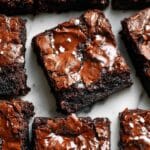 6. Cool and Serve: Remove the brownies from the oven and allow them to cool completely in the pan. Once cooled, lift the brownies out using the parchment paper overhang and cut into squares. Optionally, sprinkle with flaky sea salt before serving for an added flavor contrast.