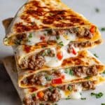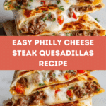 This Philly Cheese Steak Quesadillas recipe combines the classic savory flavors of a Philly cheesesteak with the crispy, melty goodness of a quesadilla. Thinly sliced ribeye steak is sautéed with bell peppers, onions, and mushrooms, then layered with provolone cheese inside flour tortillas and cooked until golden and bubbly. Perfect for a comforting lunch or easy dinner, these quesadillas bring the best of two favorites in one dish.