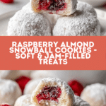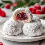 Raspberry Almond Snowball Cookies are delicate, buttery treats filled with sweet raspberry jam and coated in powdered sugar. These melt-in-your-mouth cookies make a perfect dessert for any occasion or a delightful tea-time snack.
