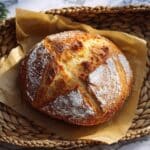 - If you don’t have a Dutch oven, bake the bread on a preheated baking stone and add steam to the oven by placing a tray of water inside.