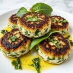 The image shows several small round patties with a golden brown, crispy outer layer that has some darker charred spots. Inside, the patties have a mix of white and green textures, indicating chopped greens mixed with a light meat or cheese filling. They are placed on a white plate with some green leafy herbs on top for garnish. Around the patties and on the plate, there is a shiny, golden oily sauce with small bits of greens scattered around. The background has a white marbled texture. photo taken with an iphone --ar 4:5 --v 7