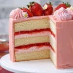 A three-layer white sponge cake is covered in smooth pink frosting. Between each sponge layer are two fillings: a thick pink cream layer and a glossy red jelly layer below it. The outside pink frosting is smooth and evenly spread. On top of the cake are fresh whole strawberries and small swirls of the same pink frosting, with a small white flower accent. The cake sits on a white plate placed on a cake stand against a white marbled surface background. Photo taken with an iphone --ar 4:5 --v 7