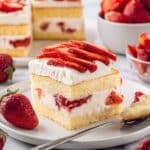This Strawberry Tiramisu is a refreshing twist on the classic Italian dessert, featuring layers of orange liqueur-soaked ladyfingers, luscious mascarpone cream, sweet strawberry preserves, and fresh sliced strawberries. Light yet indulgent, this no-bake treat is perfect for any occasion and perfect to prepare ahead, as it needs chill time to let the flavors meld perfectly.