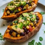 A delicious and nutritious Stuffed Sweet Potato recipe filled with a flavorful mixture of black beans, avocado, corn, cherry tomatoes, red onion, and cilantro, topped with a creamy and zesty Cilantro Lime Crema made from Greek yogurt. This meal is perfect for a wholesome lunch or dinner, offering a blend of vibrant colors, fresh textures, and satisfying flavors.