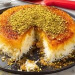 10. Cool and Invert: Remove the knafeh from the oven and allow to cool for a few minutes. Once cooled slightly, invert the knafeh onto a serving plate carefully to reveal the crisp top.