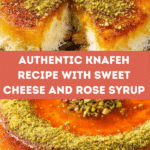 Knafeh is a rich and decadent Middle Eastern dessert made from shredded filo dough layered with sweet cheese, soaked in fragrant rosewater syrup, and baked to golden perfection. This recipe features crispy, buttery kataifi dough encasing melted cheese, topped with crushed pistachios and drizzled with aromatic syrup, offering a delightful balance of crunchy texture and gooey sweetness.