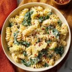 Keywords: spinach and artichoke dip pasta, creamy pasta, vegetarian pasta recipe, rotini pasta, spinach pasta sauce, artichoke hearts pasta