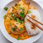 1. Prepare the Broth: In a large 12 x 8 inch (30 x 20 cm) baking dish, combine the coconut milk, red curry paste, soy sauce, rice vinegar, honey (or sugar), and sesame oil. Whisk thoroughly until the curry paste is fully dissolved with no lumps. Grate in the garlic and ginger and mix well. Optional: if serving with rice or noodles and you prefer a more brothy consistency, add ¼ cup of water and stir.