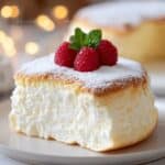 A soft, fluffy cheesecake with two main layers sits on a white plate placed on a white marbled surface. The bottom layer is light and slightly golden brown, acting as the base. The thick top layer is creamy white and very airy, showing a soft, spongy texture throughout. The cheesecake top is dusted evenly with powdered sugar, and four bright red raspberries are arranged on top, with a small green mint leaf adding a fresh touch in the center. The background is softly blurred with warm, gentle lights. Photo taken with an iphone --ar 4:5 --v 7
